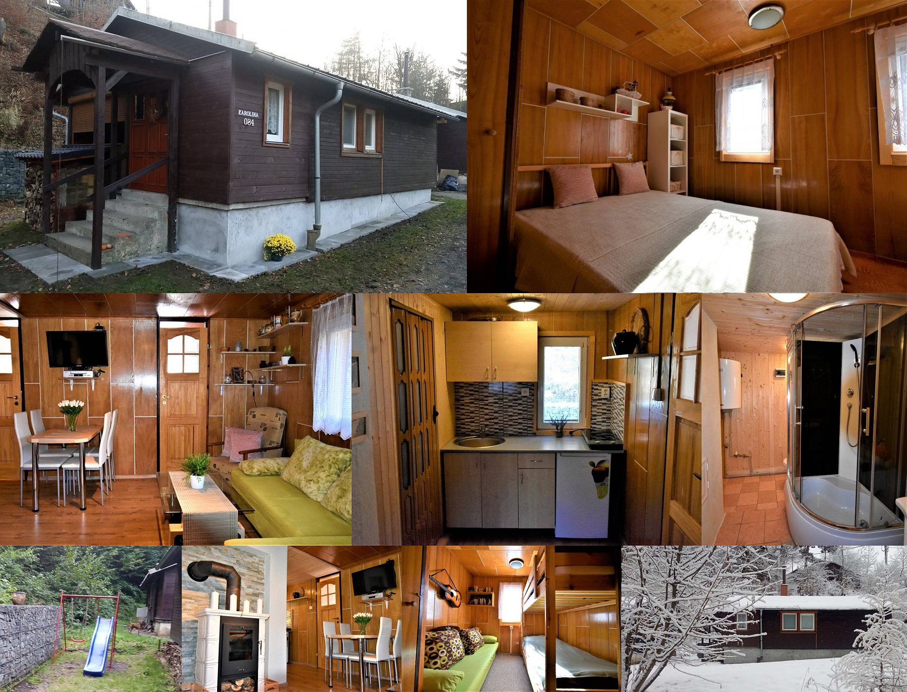 Accommodation: Dřevěná chata se vším potřebným vybavením a soukromím pro 2-5 osob. V chatě jsou 2 ložnice (v první je manželská postel, ve druhé gauč a patrová postel), vlastní koupelna s WC, obývací pokoj s krbem a TV, kuchyňka (varná konvice, lednička, mikrovlnka, el. vařič) a terasa. Krb k vytápění i navození útulné atmosféry. Před chatou je skluzavka s houpačkou. Parkovaní možné přímo u chaty (v zimě kvůli nesjízdné cestě 150 m od chaty).