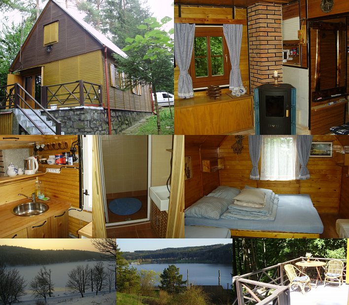 Accommodation: Dřevěná chata se dvěma pokoji a terasou. Přízemí: hlavní obytná místnost (rozkládací pohovka, stolek, křesla, TV, DVD, radio s CD, krbová kamna na dřevo, jídelní kout - stůl s lavicí a 4 židlemi), kuchyňský kout (dřez, teplá voda, el. vařič, el. trouba, kávovar, toustovač, sendvičovač, varná konvice, mikrovlnka, lednice, espreso kávovar), WC, koupelna (sprchový kout, podlahové topení, topný žebřík, bojler). Podkroví: 3-lůžkový pokoj (TV, DVD). Vytápění: kamna + el. přímotopy. Terasa: 10 m2, orientace na západ, oplocená. Venkovní posezení, ohniště, uzamykatelný sklep. Parkování pro 3 auta.