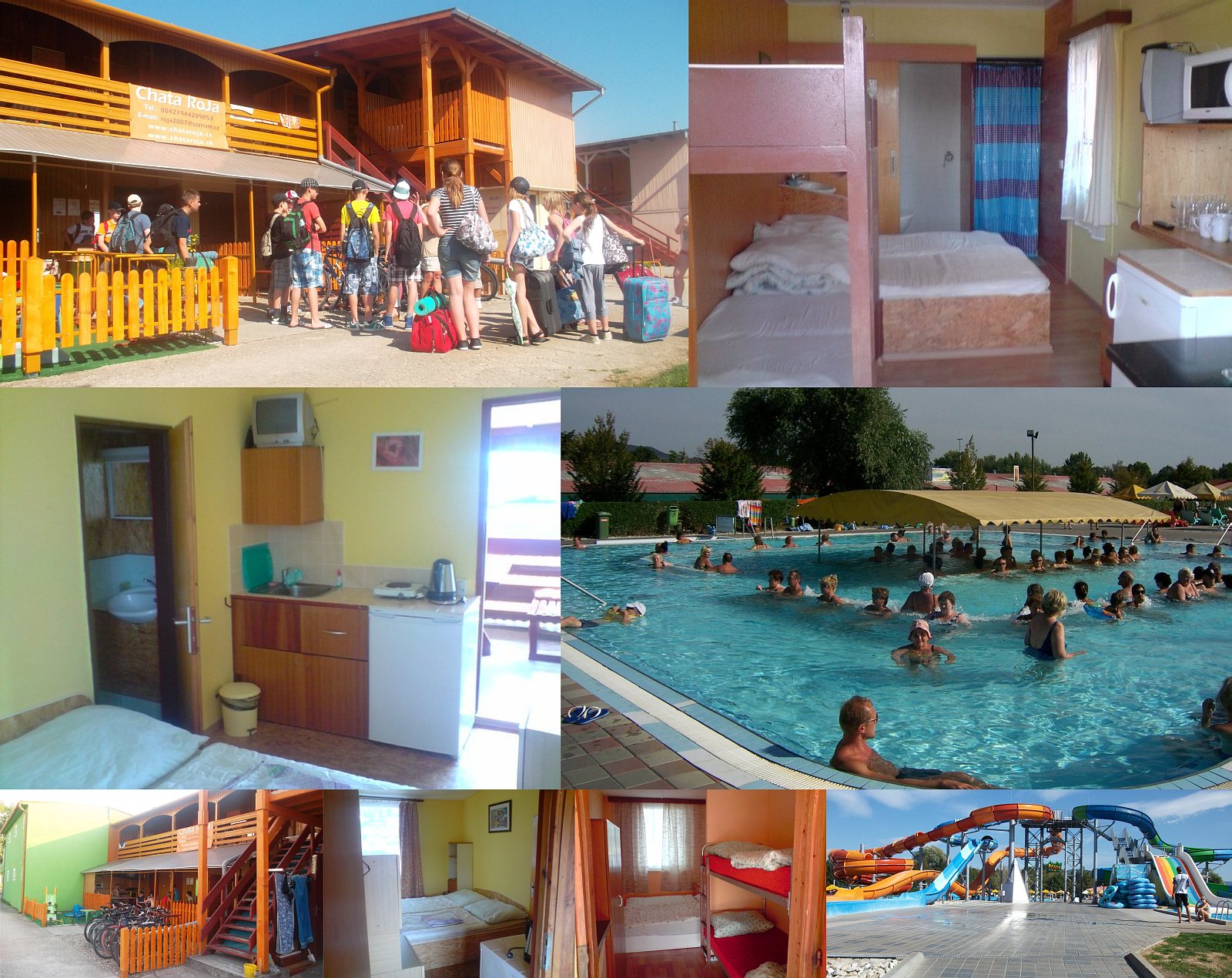 Price: Sezóna (měsíce 07-08): pokoj C 335 EUR/pokoj/týden (tj. při 4 osobách 12 EUR/os/noc), pokoj B 273 EUR/pokoj/týden, pokoj A 470 EUR/pokoj/týden. Mimosezóna (měsíce 05-06): pokoj C 10 EUR/os/noc (běžná cena pro jiné návštěvníky 16 EUR/os/noc), pokoj B 13 EUR/os/noc, pokoj A 16 EUR/os/noc (pro jiné návštěvníky 18-20 EUR/os/noc), min. 2 noci, při ubytování jen 1 osoby na pokoji příplatek 2-4 EUR/noc. Ceny jsou konečné a zahrnují i rekreační poplatek, povlečení, energie, parkovné, vstupné do venkovních bazénů i dopravu z vlakového nádraží.