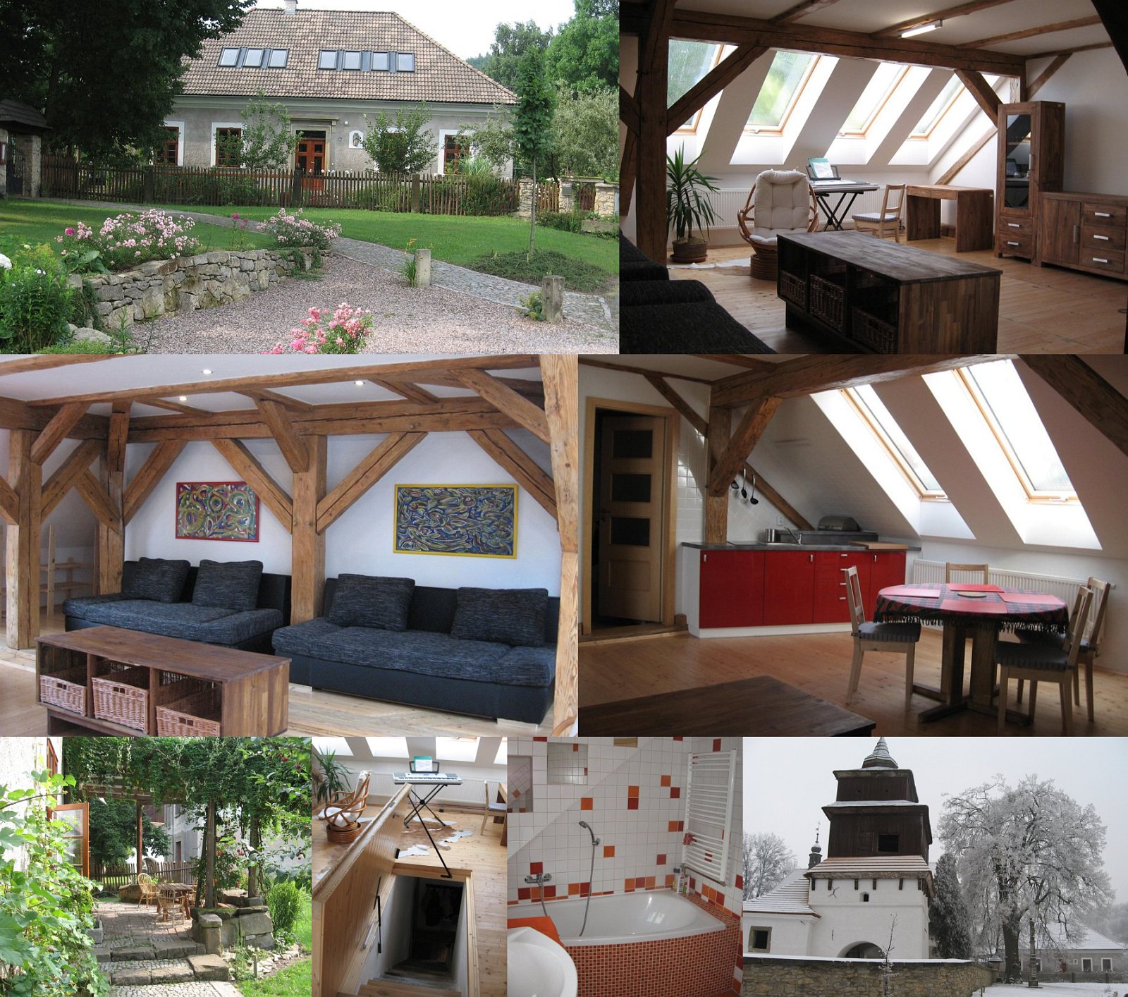 Accommodation: Bývalá venkovská fara s apartmánem v podkroví. V apartmánu je velká místnost s obytným a jídelním koutem, dvěma rozkládacími gauči a výhledem ze střešních oken, vybavená kuchyňská linka, elektronické klávesy, TV, lednice, WiFi připojení. Koupelna a toaleta jsou přístupné přes předsíňku. Apartmán je vhodný max. pro 5 osob, především pro rodiny (4 místa na dvou 2-lůžkových gaučích + dětská postýlka či přistýlka na matraci). V domě je sklípek se samoobslužným občerstvením. Zahrada s ohništěm, posezením a pískovištěm. Parkování v areálu chalupy.
