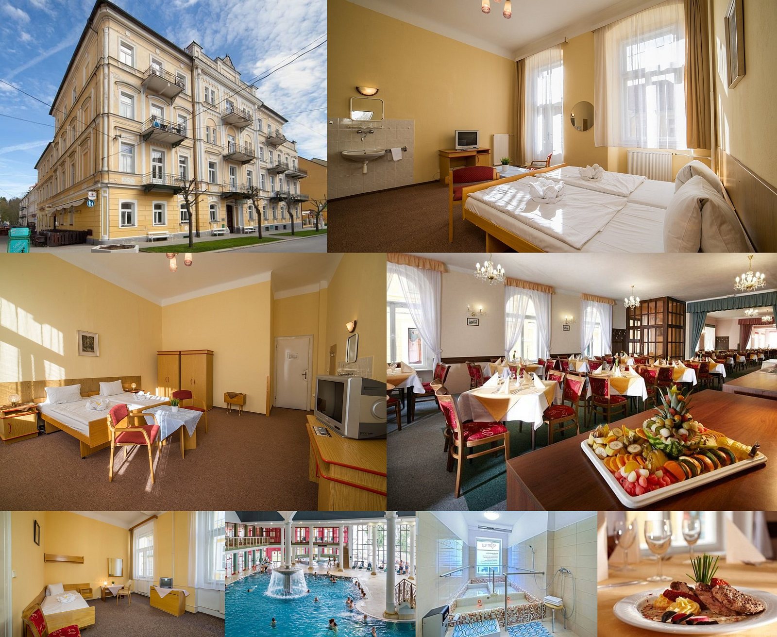 Accommodation: Lázeňský hotel s kapacitou 91 lůžek ve 48 pokojích (5x1, 43x2 lůžka). Na každém pokoji je TV, umyvadlo a trezor. Turistické pokoje mají společné sprchy a toalety (1 sprcha a WC cca pro 6 pokojů). Pokoje economy plus mají vlastní koupelnu (sprcha i WC). Na chodbách je telefon. Ve vedlejší budově Spa hotelu Goethe mohou hosté využívat léčebné procedury (včetně služeb lékaře) a rautové stravování.
