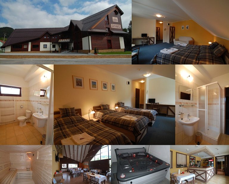 Accommodation: Penzion s izbami a apartmánmi. 1-, 2- a 3-lôžkové izby a apartmány so 2 izbami (2+2 lôžka). Izby a apartmány majú vlastnú kúpeľňu a WC, TV+SAT, chladničku. Penzion ďalej ponúká spoločenskú miestnosť, biliard, stolný tenis, stolný futbal, šípky, detský kútik, saunu, jacuzzi. V penzione je reštaurácia. Parkovanie pri dome. Penzion je nefajčiarsky.