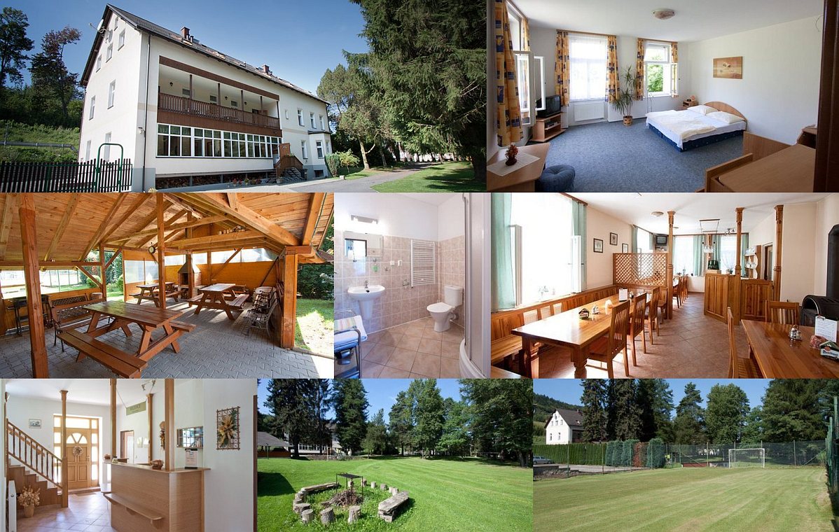 Accommodation: Nekuřácký penzion se 4 pokoji (1- až 3-lůžkovými). Každý pokoj má předsíň, koupelnu (sprcha, WC, umyvadlo, zrcadlo), pokoj (pracovní stůl, noční stolek, komoda, lůžka). Na pokojích je TV+SAT, sejf, minilednice s nealko nápoji, telefon, digitální budík. Z pokojů je vstup na krytou terasu. V penzionu je Wi-Fi. Venku je lesopark (6.500 m2), antukový tenisový kurt, minigolf, ruské kuželky, stolní tenis, dětský hrad, ohniště, uzamykatelné parkoviště. V penzionu je nekuřácká restaurace (možnost polopenze). Penzion je vhodný pro pořádání společenských a firemních akcí.