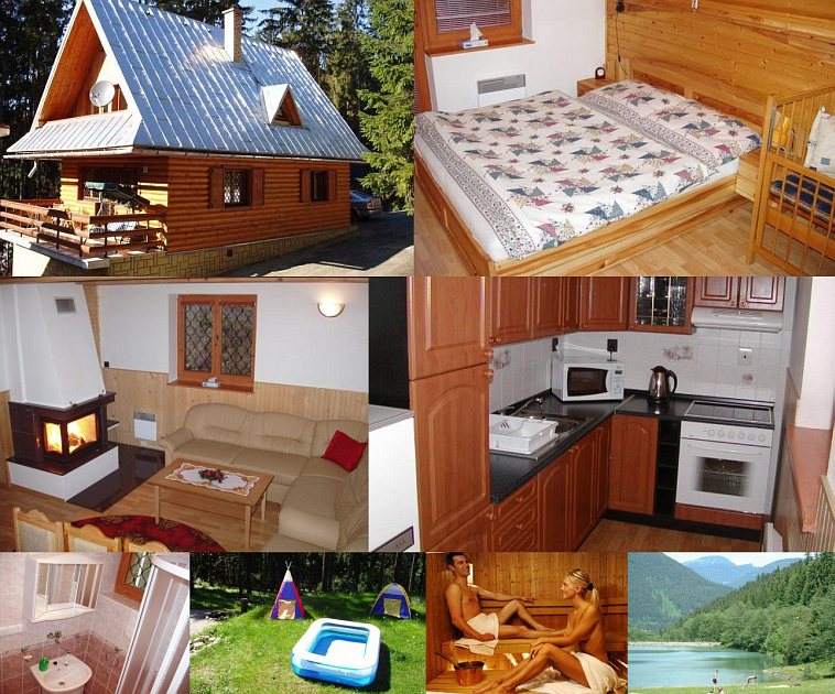 Accommodation: Nadštandardne vybavená chata pre 15 osôb, so saunou. 4 spálne (1x2, 1x2 + detská postieľka, 1x6, 1x5 lôžok). 3x kúpeľňa (2x sprchovací kút, 1x vaňa), 3x WC. Spoločenská miestnosť (krb, gauč, konferenčný stolík, FTV + SAT+ DVD), jedálenský kút, kompletne zariadená kuchyňa (chladnička s mrazničkou, el. sporák s rúrou na pečenie, mikrovlnka, kanvica, umývačka riadu). WiFi grátis. Lyžiareň. Terasa na prízemí, balkón na poschodí. Bezplatné parkovisko. Trávnatá plocha pre deti. Drevo do krbu. Vonkajšie ohnisko, záhradné posedenie, gril, kotlík na guláš.