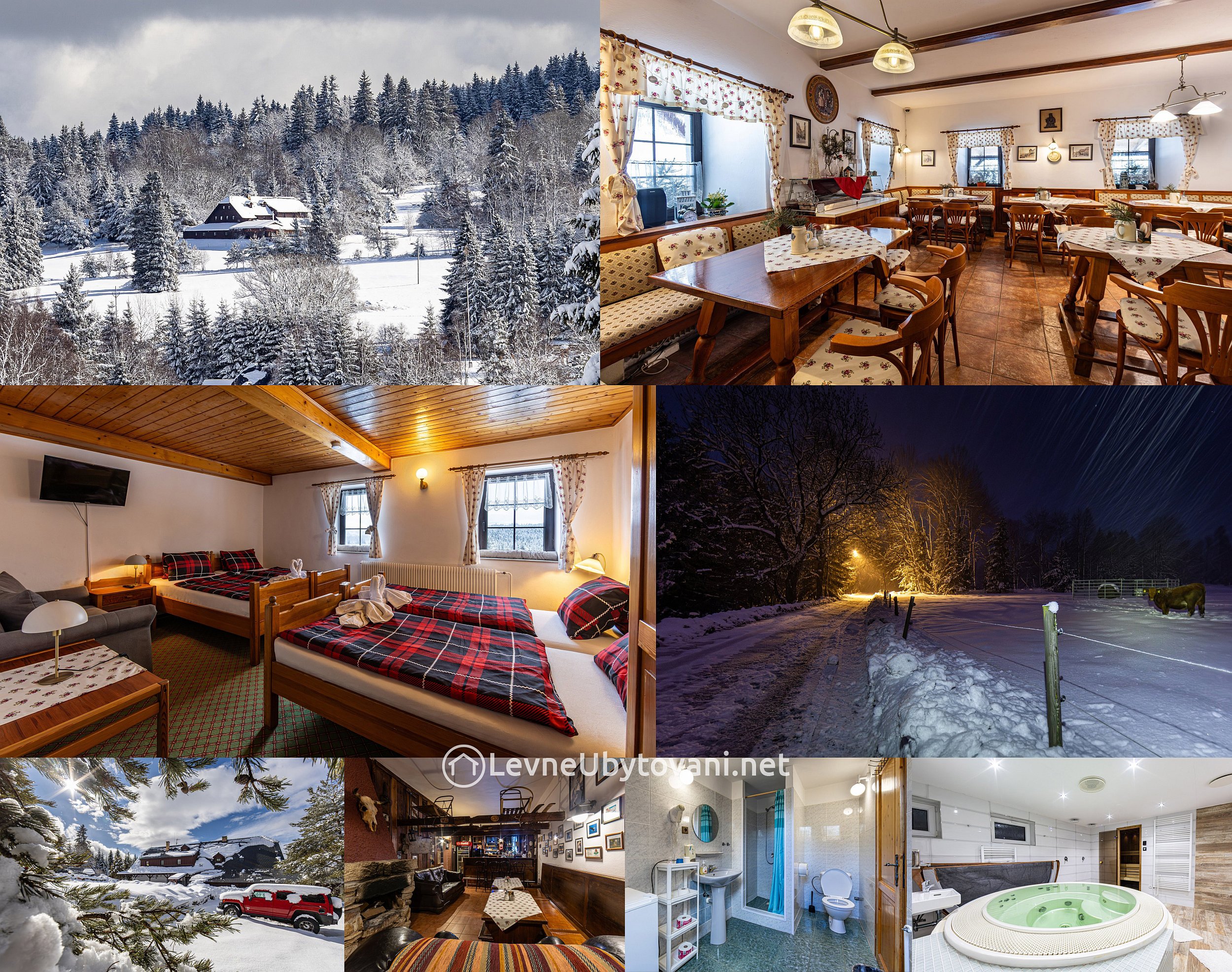 Price: Ceny jsou včetně polopenze! Celoročně mimo Silvestr: 2 a více nocí 1.350 Kč/os/noc, pouze 1 noc 1.650 Kč/os, možnost slev pro děti do 15 let. Domácí mazlíček 300 Kč/noc. Ceny platí i při ubytování jen 1 osoby.